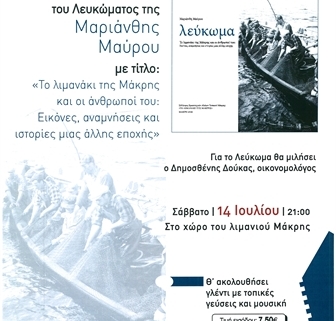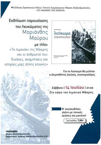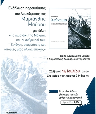 Σας ενημερώνουμε, ότι το Σάββατο 14 Ιουλίου 2018 στις 21:00, στο λιμανάκι της Μάκρης θα πραγματοποιηθεί εκδήλωση – παρουσίαση του Λευκώματος της Μαριάνθης Μάυρου με τίτλο: «Το λιμανάκι της Μάκρης και οι άνθρωποί του: Εικόνες, αναμνήσεις και ιστορίες μιας άλλης εποχής».