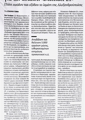 Την Τετάρτη 12 Φεβρουαρίου, ο στρατηγός Κρίστοφερ Μόχαν, διοικητής της 21ης ταξιαρχίας υποστήριξης των αμερικανικών δυνάμεων στην Ευρώπη, πέταξε στην Αλεξανδρούπολη και συμμετείχε σε συσκέψεις για την προετοιμασία της νατοϊκής άσκησης «Defender (Αμυντικός) 2021» στις ακτές της Μαύρης Θάλασσας. Οταν ο πρόεδρος του τοπικού λιμανιού, που θα χρησιμοποιηθεί ως πύλη εισόδου και εξόδου στρατευμάτων και οπλισμού, Κωνσταντίνος Χατζημιχαήλ, του προέβαλε το βίντεο με τις εγκαταστάσεις, αναφώνησε λέγοντας ότι «οι δυνατότητες είναι τρομακτικές».
