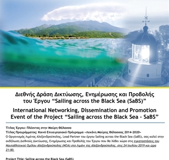 O Οργανισμός Λιμένος Αλεξανδρούπολης, Lead Partner του έργου Sailing across the Black Sea (SaBS), σας καλεί στην εκδήλωση Διεθνούς Δικτύωσης, Ενημέρωσης και Προβολής του Έργου που θα λάβει χώρα στις εγκαταστάσεις του Ναυταθλητικού Ομίλου Αλεξανδρούπολης (ΝΟΑ) στο Λιμάνι της Αλεξανδρούπολης, στις 24 Ιουλίου 2019 και ώρα 21:00.